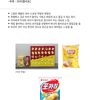 좋아하는 대중적인 과자로 팝아트를 표현하였다. 과자봉지 질감의 사실적인 표현과 재미있는 그림을 함께 보여주며 알쏭달쏭 흥미로운 느낌을 주고자 하였다.